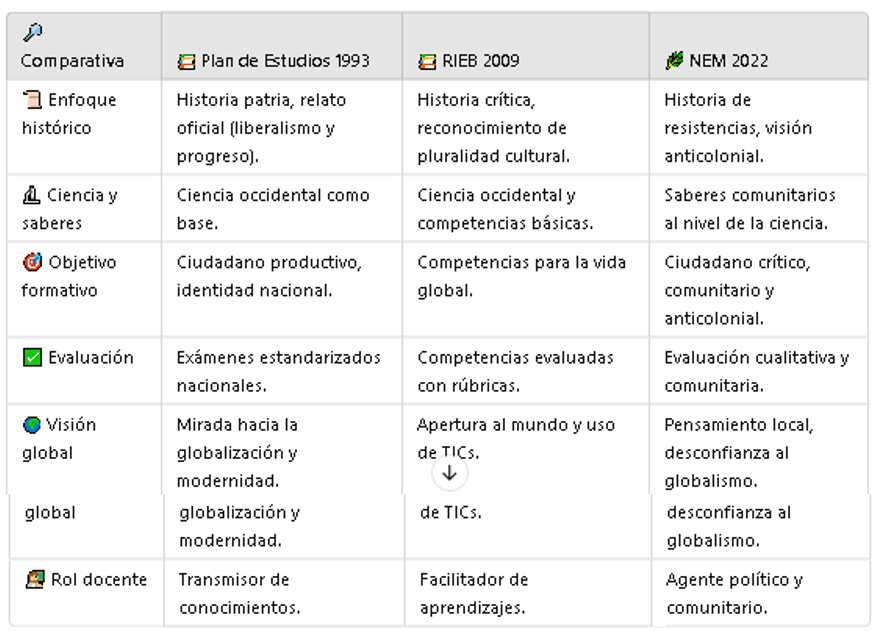 NEM y decolonialidad: Propone que la comunidad sea protagonista de la educación, aportando sus saberes, tradiciones y formas de organización.Tabla Comparativa: Enfoques Educativos