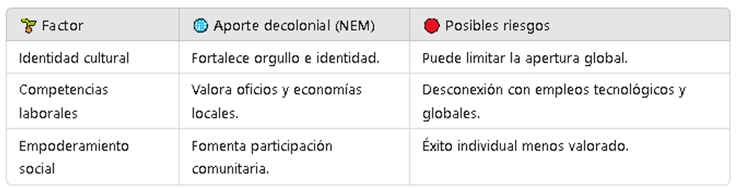 - La NEM y la decolonialidad buscan pertinencia local: que la escuela dialogue con su comunidad, reconozca su historia de exclusión y colonización, y valore su identidad cultural. Pero eso no significa que rechace lo global o científico, sino que lo pone en diálogo con lo propio.